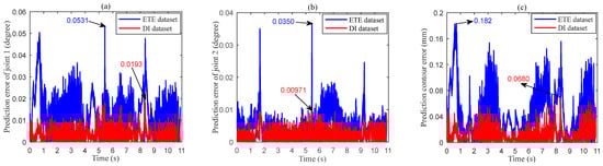 To validate the effectiveness of the DI dataset for improving prediction accuracy, the interpolation and position prediction of two test paths (Figure 12 and Figure 13) are conducted by the proposed HDPP where RECs are trained by the DI dataset and ETE dataset, respectively. The training configuration parameters are completely consistent. The prediction results are shown in Figure 14 and Figure 15, and the detailed comparisons are illustrated in Table 3. The maximum error, MAE, and RMSE of the prediction are calculated. As can be seen, the prediction results of joint 2 are generally superior to those of joint 1 due to the simple load characteristics. By comparison, the maximum prediction errors and MAEs of the joint and contour errors are reduced by more than 50% when using the DI dataset. Meanwhile, the decreased RMSEs of the joint and contour errors indicate the effectiveness of the DI dataset in improving prediction stability. Consequently, the DI dataset involves more dynamic features of the predicted system with identical experiments and can improve the prediction accuracy, adaptability, and stability of the neural network model.