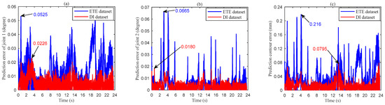 Prediction results of the heart path with different datasets. (a) Prediction error of joint 1. (b) Prediction error of joint 2. (c) Prediction contour error.
