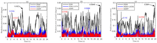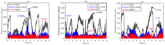 Prediction results of the heart path with different methods. (a) Prediction error of joint 1. (b) Prediction error of joint 2. (c) Prediction contour error.