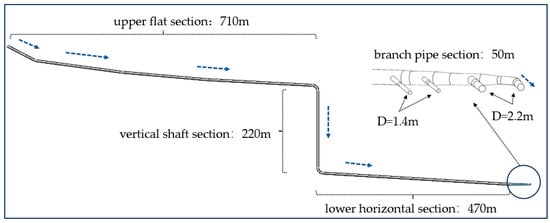 This study originated from the construction of the Kuitun River water diversion project, specifically the secondary hydropower station, the Xinlongkou Station. The water source was drawn from the upstream forebay of the station, and the pressure pipeline was designed in a one-pipe, four-machine configuration consisting of open pipe sections, vertical shafts, and branch pipe sections. The pressure water pipe was a single steel pipe, approximately 1450 m long with a diameter of 4.1 m, designed to divert a flow rate of 48.5 m3/s, with an internal flow velocity of 3.83 m/s, a design head of 342.304 m, and the design maximum water hammer pressure for this project is 4.2 MPa. Three branch pipes were arranged at the end of the pipeline, configured in a “T” shape, with branch diameters of 2.2 m (for large units) and 1.4 m (for small units). The branch pipelines were positioned parallel to each other on the same horizontal plane with valves installed at the end of each branch. The lengths of the branch pipelines X2, X1, D2, and D1 were 33.5, 29.5, 25.5, and 21 m, respectively. Reducer pipes were installed along the branches at distances of 18, 14, 10, and 5.5 m from the branch origins. The diameters of branch pipelines X1 and X2 were reduced to 1.1 m, whereas those of branch pipelines D1 and D2 were reduced to 1.9 m. The valve diameters matched those of the pipelines after the reductions. The actual layout of the onsite water diversion pipeline and the proposed model setup are illustrated in Figure 1, which includes the direction of water flow, upstream and downstream positions, and installation sequence of the various units in the hydropower station.