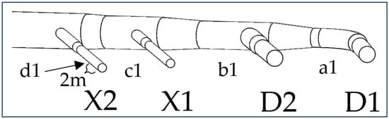 Positions a1, b1, c1, and d1 correspond to the centerline locations of the pipelines upstream of valves D1, D2, X1, and X2, respectively. For ease of detection, all monitoring points were positioned 2 m upstream of their respective valves. The specific locations are shown in Figure 3.