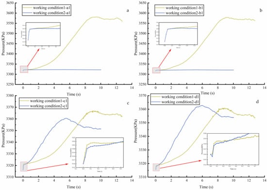This figure illustrates the water hammer pressure responses for different pipeline diameters and valve closure configurations. Each subplot (I–IV) corresponds to different valve closure strategies, with conditions 1 and 2 in the figure representing the water hammer pressure curves at the terminal valves of pipelines with different diameters. In each subplot, curves a1, b1, c1, and d1 represent the pressure variations at the terminal valve monitoring points, whereas curves a, b, c, and d indicate the pressure variations at the monitoring points with the valve open. As shown in Figure 8, the pressure peaks at the closed valve end (a1, b1, c1, d1) are generally higher than those at the open valve end (a, b, c, d), and after a rapid rise in the initial phase, the pressure gradually stabilizes. In Figure 9a,b, the pressure increase rate for pipelines with larger diameters (Condition 1) is higher than that for pipelines with smaller diameters (Condition 2), reaching a stable value in a shorter time, indicating that larger-diameter pipelines are more prone to high transient pressures. In Figure 9c,d, the pressure at the closed valve end (c1, d1) exhibits significant oscillations after reaching the peak, reflecting the more pronounced volatility of larger-diameter pipelines under the water hammer effect. Figure 10 magnifies the pressure variation details in the initial phase (0–2 s), further illustrating the effects of different pipeline diameters and monitoring point locations on the transient water hammer response. These results indicate that the selection of different diameters and monitoring point locations significantly affects the water hammer effect, thereby providing theoretical support for optimizing valve control strategies and mitigating water hammer impacts.