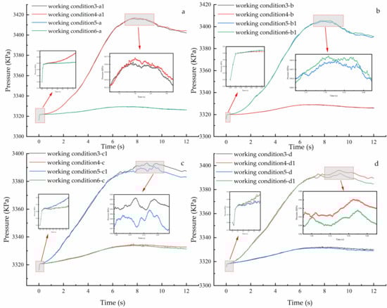 Based on the results under these four conditions shown in Figure 11, it was determined that the distance between the branch pipes in the Xinlongkou Power Station had little effect on the maximum water hammer pressure. Under the conditions involving the small and D1 unit valve closures, the maximum water hammer pressures at monitoring point a1 were 3416 and 3417 kPa, respectively. The corresponding maximum pressures at the small unit valve closure monitoring points c1 and d1 were 3393 and 3391 kPa, respectively. Under the conditions involving small and D2 unit valve closures, the maximum pressures at monitoring point b1 were 3405 and 3406 kPa, respectively, whereas the corresponding maximum pressures at the small unit valve closure monitoring points were 3399 and 3394 kPa, respectively. These results indicate that the varying distances between the small and large units at this power station had almost no effect on the maximum water hammer pressure in the pipeline.