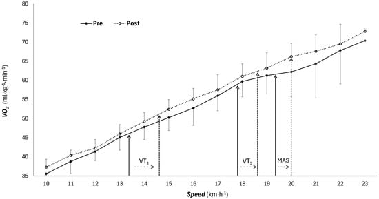 The results from the physiological, spatiotemporal, and neuromuscular variables during the GXT are shown in Table 3. There were significant differences (p < 0.05) between time points (pre–post) in the speed of VT1, VT2, and MAS, in the oxygen cost of VT1 and VT2, in the relative VO2max, and in the percentage of VT1. There was a significantly higher speed of VT1 (13.44 ± 1.65 vs. 14.67 ± 1.61 km·h−1), VT2 (17.94 ± 1.86 vs. 18.61 ± 1.72 km·h−1), and MAS (19.44 ± 2.09 vs. 20.00 ± 2.03 km·h−1) in the post-test compared to the pre-test. The oxygen cost of VT1 (46.69 ± 6.29 vs. 51.38 ± 4.83 mL·kg−1·min−1) and VT2 (58.83 ± 8.13 vs. 62.53 ± 6.61 mL·kg−1·min−1) significantly increased in the post-test. The relative VO2max was significantly higher (61.55 ± 8.77 vs. 64.53 ± 7.00 mL·kg−1·min−1) in the post-test. The percentage of VT1 significantly increased (76.06 ± 3.95 vs. 79.90 ± 5.28%) in the post-test (Figure 2). However, there were no significant differences in the spatiotemporal and neuromuscular variables during the GXT.