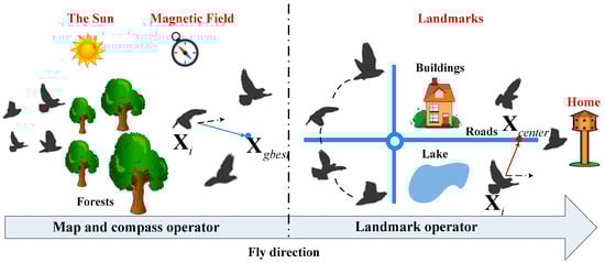 Research indicates that pigeons navigate their way home by utilizing the Earth’s magnetic field, the sun, and various landmarks [41,42]. As illustrated in Figure 1, when pigeons fly from a distant location, they use a compass-like tool for navigation [16]. During the journey, they gradually rely on landmarks to correct their routes. Pigeons that are unfamiliar with the landmarks will follow experienced ones to reach their destination.