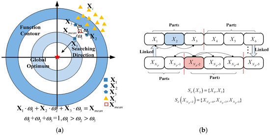 where is a set. is the element number. is a weight coefficient, , . Figure 2a illustrates a special case . The exploration ability primarily depends on . When , Formula (6) is equal to Formula (1). When , an individual can learn from the average position of the entire population.