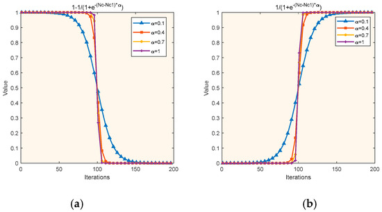 Exploration is essential in the initial stage to perform the global calculations and locate the optimum regions. To achieve a smooth transition between the two stages, the sigmoid functions and are designed with additional , and thus, it is necessary to analyze its influence. Figure 3a,b present the cases of with , . It can be seen that the function values decrease with . The curves become steeper as increases. When , the values are nearly equal to 1. When , the values are approximately equal to 0. As to the function , when , it maintains the relative independence of the two stages while ensuring a smooth transition. Therefore, the speed and position updating can be rewritten as follows: