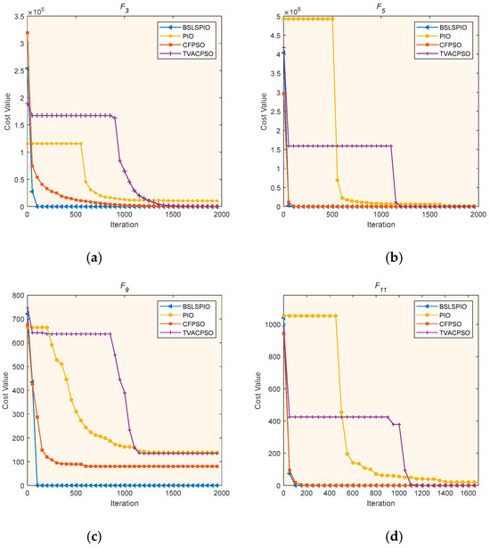 To validate the aforementioned conclusion, two typical uni-modal functions, F3 and F5, and two typical multi-modal functions, F9 and F11, are presented in Figure 4. It is evident that the BSLSPIO exhibits the fastest convergence speed, whereas the CFPSO, TVPSO, and PIO have comparatively slower convergence rates. To further assess the extensibility of the BSLSPIO, experiments are conducted on the same functions with N = 1000. The simulation results demonstrate that the BSLSPIO achieves optimal solutions for functions F1 to F4, F6, and F9 to F11. Under the condition of absolute precision, F7 is also regarded as having found the optimal solution. Although the BSLSPIO does not attain optimal solutions for functions F5, F8, F12, and F13, the BSLSPIO still demonstrates impressive performance even in high-dimensional scenarios.