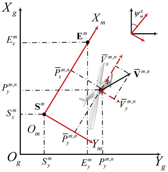 Assuming that the path planning begins at time and finishes at time , the time increment between waypoints is equal for UAVs. Given the waypoint number (the meaning of this variable is the same as the spatial dimension of the BSLSPIO), the time interval between two points is . In addition, the UAVs maintain constant altitudes and the global frame is simplified to , and the velocity and position of UAV at waypoint are denoted as , , respectively. When the starting and ending points are and , the navigation point is expressed as follows: