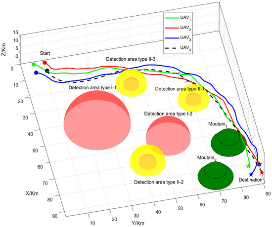 The BSLSPIO is utilized to generate the optimal for each UAV while minimizing the cost. The dimension of the BSLSPIO aligns with the waypoints represented by . Then, the global velocity and position can be obtained. The parameters are detailed in Table 5, and the path-planning results are illustrated in Figure 6. The procedure is summarized by the following steps.