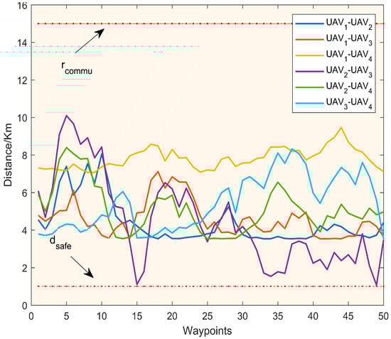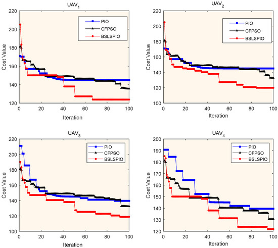 As illustrated in Figure 6, the outlooks of detection units (represented by the forbidden areas) are simplified to hemispheres. All UAVs navigate around the detection units and obstacles, generating paths from the start points (marked in circles) and the end points (marked in stars). Different colors denote different UAVs. Although there are some overlaps and crossing points among different UAVs’ paths, this does not imply that there are collisions among UAVs, as their arrival times differ. Figure 7 displays the relative distance between UAVs. The results demonstrate that the distances satisfy the constraints of safe distance and communication range, which is consistent with the proposed models. In other words, the paths are safe and realizable during the cooperation. If the trajectories are excessively dispersed, an increase in length cost is inevitable. It is also challenging to satisfy the coordination constraints if the communication distances between UAVs are too far. Therefore, path crossovers are essential to some extent. To assess the performance of the proposed BSLSPIO, comparison tests are also conducted on the PIO, BSLSPIO, and CFPSO. As shown in Figure 8, the BSLSPIO outperforms the others in both convergence speed and optimal solutions. For UAV1-UAV4, the cost values of the BSLSPIO are 123.88, 119.88, 122.88, 121.88, respectively. The conclusion is consistent with the previous analysis mentioned above. In conclusion, the BSLSPIO effectively addresses the cooperative path-planning problem involving detection netting and flight constraints through the development of path-planning models.