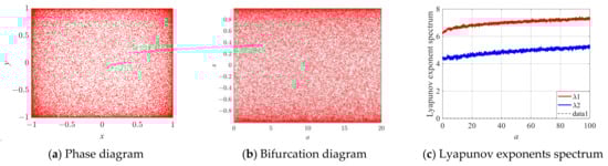 In order to further verify the validity of the proposed structure, a map can be mathematically represented by Equation (3). The phase diagram, bifurcation diagram, and Lyapunov exponential spectrum of the system are briefly analyzed as shown in Figure 2, where λ1 and λ2 represent the two Lyapunov exponentials, and data1 represents the 0. It is shown that the system also has the optional large parameter range and complex chaotic behavior.