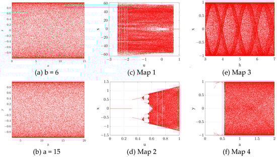 The bifurcation diagram can effectively and intuitively illustrate how the system’s state changes with variations in parameters. As the parameters vary, the system’s state undergoes corresponding adjustments []. Set the initial values as = 10 and = 2, and the analysis can obtain the 2D bifurcation diagram as shown in Figure 4a,b. This paper also tests the bifurcation diagrams of Maps 1–4 as shown in Figure 4c–f, which were proposed in recent years. This bifurcation diagram demonstrates that our map maintains a stable chaotic state over a wide range. Consequently, the proposed 2D hyperchaotic map exhibits characteristics of high complexity, unpredictability, and sensitivity.
