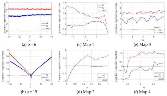 In the proposed 2D hyperchaotic map, with b held constant at 6 while a is varying within the range of [−40,40], the Lyapunov exponential spectrum is illustrated in Figure 5a. When a is fixed at 15 and b is varying within the range of [−40,40], the Lyapunov exponent spectrum is illustrated in Figure 5b. The Lyapunov exponents of Maps 1–4 as shown in Figure 5c–f are also tested, and the comparison reveals that both exponents of the system are greater than 0 and remain stable over a large range. Therefore, the system remains in a stable chaotic state, demonstrating intricate nonlinear dynamics and strong sensitivity to initial conditions.