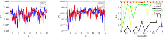 When the system parameter b is set to 6 or a is set to 15, the results are presented in Figure 6. The results demonstrate that the value of the new 2D hyperchaotic sequence surpasses 0.997, and its randomness is signifying exceptional. To further validate the sequence’s randomness, this paper compares the proposed 2D hyperchaotic map and the four existing chaotic systems mentioned earlier as shown in Figure 6. The comparison highlights the higher and more stable PE complexity of the proposed 2D hyperchaotic map, indicating superior randomness.