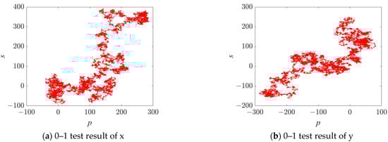 The 0–1 test is a method for assessing the chaotic nature of a mapping function and determining if it behaves chaotically. In contrast to the Lyapunov exponent, the 0–1 test does not require phase space reconstruction and instead focuses solely on observing changes in the input values of the map function within the interval [0,1] to evaluate chaotic properties []. With a constant c, the test results of the sequence can be calculated as Equation (4).