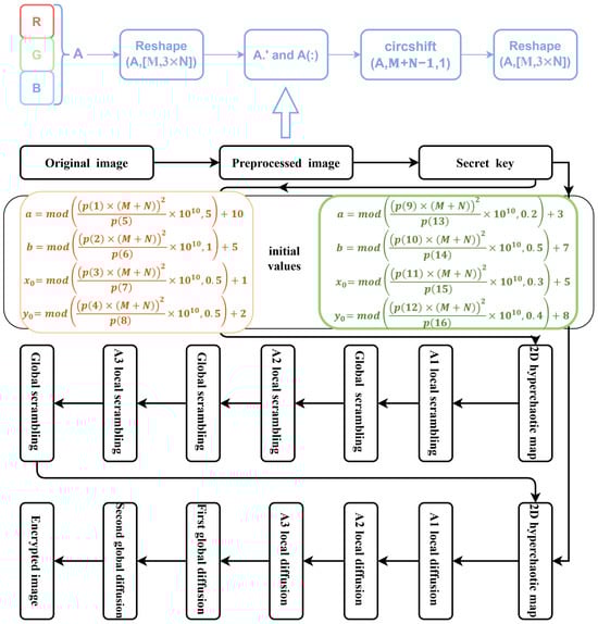 Capitalizing on the remarkable chaotic properties exhibited by the proposed chaotic map, this section introduces the SEME-TDHM algorithm grounded in the 2D hyperchaotic map. This algorithm encompasses preprocessing, scrambling, and diffusion processes, as visually depicted in Figure 8. The specific encryption procedure is detailed as follows: A1, A2, and A3 represent the pixel values of the RGB channels, respectively.