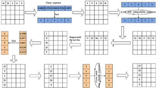 - Full channel random scrambling: In the previous step, P1 for M 3N was obtained. In this step, the chaotic system is used to generate the index sequences s1, s2 and the offset sequences uu1, uu2. The rows and columns of P1 are sorted according to Algorithm 1, with the row and column index sequences randomly shifted before each sort. Figure 9 provides an example containing 5 × 5 images with the steps outlined below;Figure 9. Global scrambling.