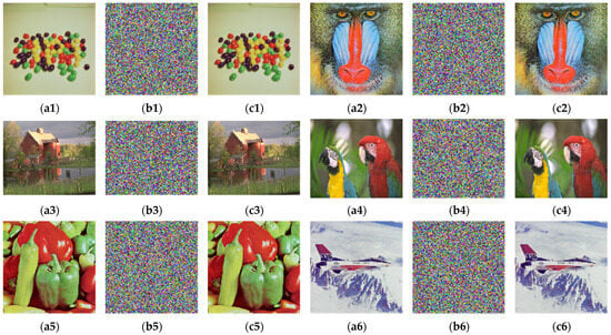 Encrypted and decrypted images, original images are (a1) Candy, 256 × 256, (a2) Baboon, 512 × 512, (a3) House, 614 × 409, (a4) Bird, 768 × 512, (a5) Pepper, 1000 × 1000, (a6) Aircraft, 1024 × 1024; its corresponding encrypted images are (b1–b6); its corresponding decrypted images are (c1–c6).