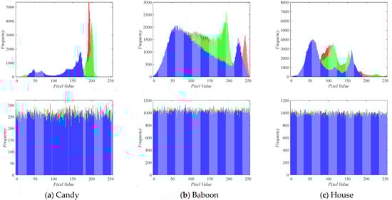 Histogram analysis of images and cipher images: Red represents the R channel; green represents the G channel; blue represents the B channel.