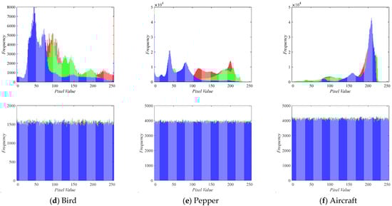 In contrast, the histogram of an encrypted image, especially one using an ideal cryptographic method, shows uniform pixel value frequencies and an even distribution throughout the image. As depicted in Figure 12, the histograms of both the original image and its corresponding encrypted image are displayed. The results unequivocally reveal that the histogram of the encrypted image exhibits a uniform distribution, effectively enhancing its ability to resist attacks.