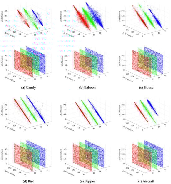A key objective of encryption algorithms is to eliminate the correlation between pixels in an image, ensuring that the encrypted image is resistant to restoration or decryption. In this paper, the correlation between pixels is effectively obscured, and the confidentiality of the encryption is strengthened by applying operations such as scrambling and diffusion to neighboring pixels []. These techniques significantly enhance the security of the encrypted image, making it resistant to simple restoration or decryption attempts. To quantify the correlation among encrypted images, the correlation coefficient of pixel values is computed using Equation (11):