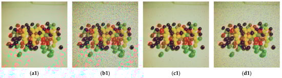 Noise test results of Candy, House and Pepper, Gaussian noise of (a1–a3) 1 × 10−7, (b1–b3) 1 × 10−6, Pepper and Salt noise of (c1–c3) 0.001, (d1–d3) 0.01.