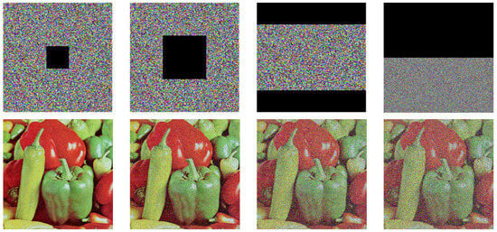 Images are susceptible to loss during transmission or storage. To comprehensively assess the SEME-TDHM algorithm’s performance, this study includes a simulation of data loss by cropping the encrypted image as shown in Figure 15. The results indicate that the greater the extent of image loss, the more obscured the original image appears upon decryption. However, even with significant loss, some recognizable details of the image are still visible to the naked eye. This underscores the SEME-TDHM algorithm’s efficacy in resisting data loss to a certain extent.