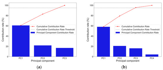 After standardizing the data obtained from the feature selection process, KPCA was employed for dimensionality reduction. Figure 3 illustrates the contribution rates of different principal components at various dimensions. By setting the cumulative contribution rate threshold to 95%, it is evident that PC3 provides a relatively high contribution rate, while PC4 contributes less than 5%. Consequently, reducing the dimensionality to 3 is considered an appropriate choice.