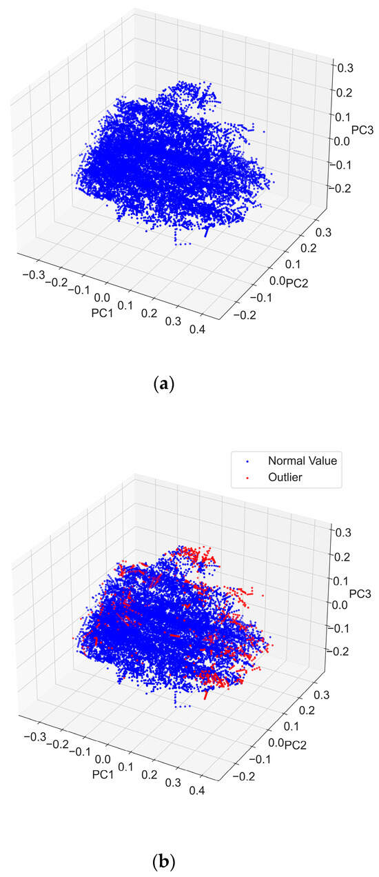 Visualization of data after dimension reduction for wheelsets. (a) Original data after wheelset dimensionality reduction. (b) Outlier-removed data after wheelset dimensionality reduction.