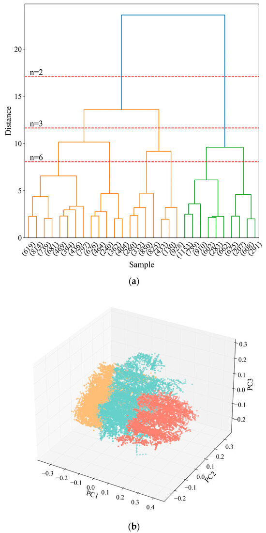 Training data classification learning results. (a) Hierarchical clustering dendrogram. (b) Data classification corresponding to different health states.