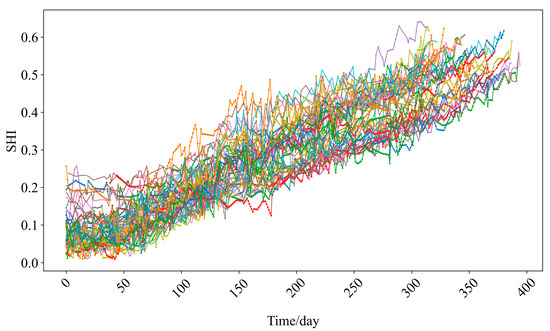 Using the geometric center of subclass SUB1 of the wheelset healthy class (−0.1647, 0.0095, 0.0707) as the baseline, the SHI for all training samples is calculated using Equation (15). The SHI for the testing samples can be derived based on similarity, as illustrated in Figure 7. The SHI is a one-dimensional indicator that varies over time; a larger value signifies a worse health status. As time progresses, the increasing trend of the SHI corresponds with the deterioration trend of the wheelset.