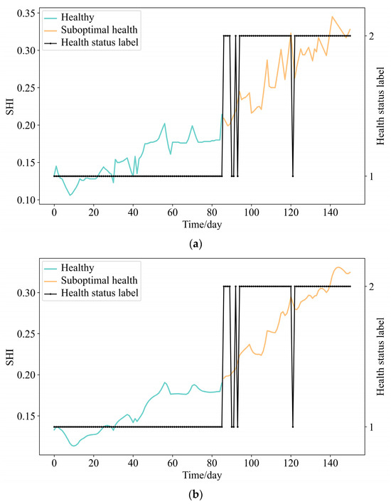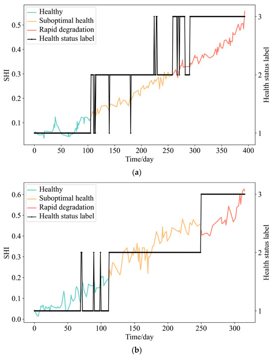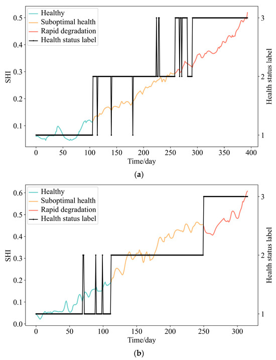 Health status and SHI of random samples in the training set. (a) Wheel #226 health status and SHI. (b) Wheel #652 health status and SHI.