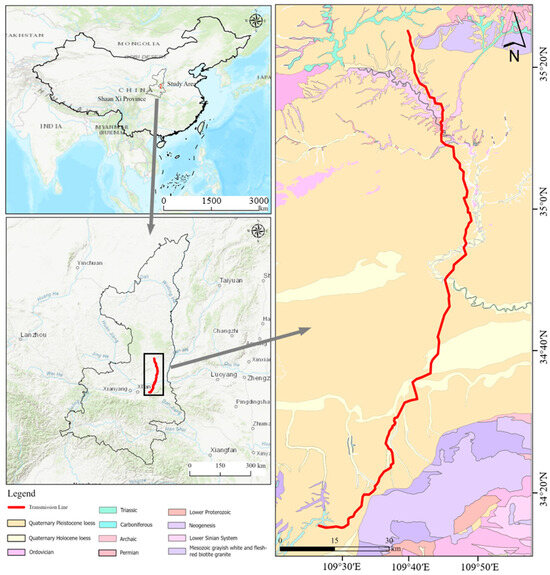 The power transportation network construction in China has the characteristics of large scale, long distance, and high coverage. It is used to transmit energy over long distances within the country and enables China to lead the development of renewable energy globally. The Loess Plateau has long been a critical region of the interaction between human activities and natural processes, and it is also the top priority of China’s “Belt and Road” strategic layout. However, loess has poor shear resistance, porous structure, and collapsibility. The terrain in the Loess Plateau region is undulating, with steep slopes and complex geological conditions, posing significant challenges to maintaining slope stability during engineering construction. With the continuous advancement of social development and engineering construction, the disturbance of the loess layers by human engineering activities can easily destroy their natural structure and reduce the bearing capacity of the foundation. These factors contribute to the frequent occurrence of geological disasters in the loess region [1], accounting for one-third of all geological disasters in China and posing significant threats to infrastructure, agriculture, and the safety of people’s lives and property [2]. Therefore, effectively implementing disaster mitigation and risk prevention measures in the Loess Plateau has become an urgent issue that needs to be addressed.