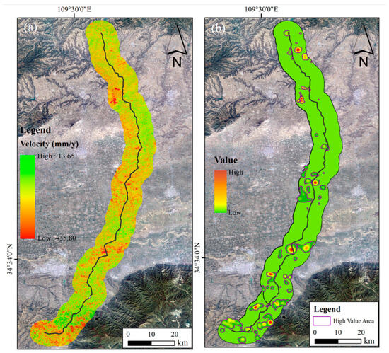 Hotspot analysis and kernel density analysis were performed using the spatial statistics tools in ArcGIS software to facilitate the rapid identification of large deformation areas [31].