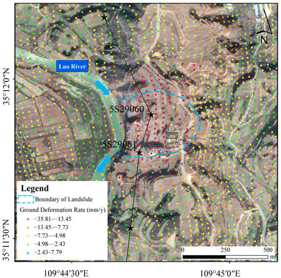 Landslide No. 9 is located on the west side of Gaojiamao, Fengyuan Town, Chengcheng County, Weinan City, Shaanxi Province. As shown in Figure 5, the landslide exhibits a tongue-shaped plane with crisscrossing gullies in the area. A highway can be seen on the upper part of the slope, and the dynamic load of vehicles affects the stability of the loess soil at the top of the slope. The front edge is adjacent to the Luo River with a steep slope. The landslide exhibits a high deformation rate, with data incoherence observed in some regions. Field investigations revealed that the deformation zone partially overlaps with the goaf area of the Anli coal mine. The overall deformation rate of the landslide ranges from −35.8 mm/y to 1.44 mm/y, with a general downward deformation trend. Proposed transmission towers 5S29060 and 5S29061 would be located on the mid-to-lower section of the landslide body, above the second-level platform. From the deformation rate map, it can be observed that the deformation rates at 5S29060 and 5S29061 are higher than those of the surrounding deformation points. Below 5S29060, near the Luohe River and its outlet, a significant deformation point loss is visible. This phenomenon continues down to 5S29061. In addition to the influence of the steep slope and satellite orbit direction, it is speculated that the major deformation is primarily caused by river erosion of the slope.