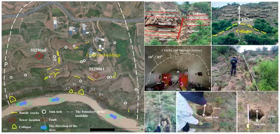 Field investigation photos of landslide No. 9. (a) UAV model and deformation phenomenon distribution map of landslide No.9; (b) A field investigation photo of fault F3; (c) Small scale collapse phenomenon; (d) A crack that penetrates through the house; (e,f) represent cracks on the slope; (g,h) are sinkholes.