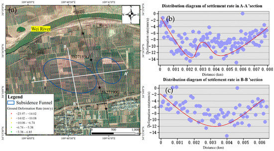 Land subsidence No. 29 is located between the farmland north of Taiping Village and the Xiaozhangtan forest area in Xinzhuang Township. The surface deformation rate ranges from −23.97 mm/y to 6.85 mm/y, with an overall downward trend. The area is approximately 0.846 km2, with a relatively flat terrain and elevation between 301 and 310 m. Two profiles, AA’ and BB’ (as shown in Figure 7a), were selected at the subsidence point for the rate distribution profile diagrams shown in Figure 7b,c. Both profile diagrams exhibit the same pattern: the profile lines form a funnel shape, and the deformation rates show a trend of small–large–small from one end to the other, with a maximum rate of −13 mm/y. These characteristics are similar to those observed by Zheng et al. [34], and the lowest point appeared twice in the AA’ profile, indicating the presence of two subsidence funnels in this region, as shown in Figure 7a. These funnels are elliptical in shape. The western funnel is significantly larger than the eastern one, with the long axes measuring 1.21 km and 0.67 km and the short axes measuring 0.92 km and 0.47 km, respectively. The proposed transmission towers, 5S27189G and 5S27190G, would be located between the two funnels. The deformation rates on either side of the towers would vary, leading to uneven subsidence, which poses a threat to the stability of the tower foundations.