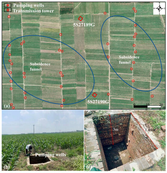 The area is mainly composed of cultivated soil and loess-like silty clay with numerous visible pumping wells, as shown in Figure 8a. The wells are about 2–3 m deep, as shown in Figure 8b,c, and there is periodic water extraction for irrigation. North of the subsidence point is the Wei River, with a grove of trees visible between the river and the subsidence area. The terrain is slightly elevated, forming a steep bank with a height difference of about 2 m between the river and the farmland. The erosion and scouring of the river have caused severe damage to the steep bank, leading to its gradual retreat, with some larger trees now positioned in the middle of the eroded bank. Near the steep bank, several depressions were observed during the investigation. It was found that these depressions are mainly due to the slightly higher terrain of the grove, where surface water accumulates and infiltrates toward the farmland, forming erosion channels. The unique properties of loess further influence the formation of these characteristics. Therefore, the ground subsidence in this area results from the combined effects of agricultural irrigation, groundwater extraction, and the properties of loess. The uneven subsidence of the ground is likely to impact the construction of the transmission line towers.