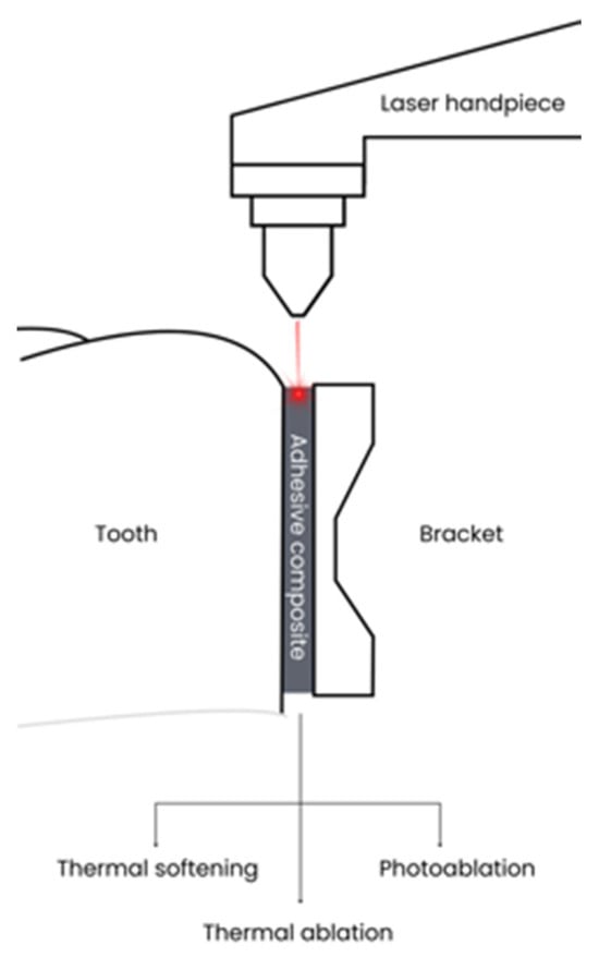 One potential method for debonding orthodontic metal brackets is the use of lasers. Three primary mechanisms describe this process: thermal softening, thermal ablation, and photoablation (Figure 1). The heat generated by the laser causes thermal softening of the adhesive material, enabling the bracket to detach from the tooth surface [4]. When the resin is heated rapidly enough to reach its vaporization temperature, thermal ablation occurs. This process precedes debonding via thermal softening, leading to the bracket’s detachment from the tooth surface [21,22]. Photoablation is a mechanism where high-powered laser light interacts with the adhesive resin, causing the bonding energy level between the adhesive atoms to exceed the dissociation energy threshold [23]. This results in the decomposition of the resin material, allowing the bracket to debond [24]. There are many types of lasers; only some of these were evaluated in the included studies. They differ in the energy source (flashlight, diode, chemical reaction), the gain medium (solid state lasers such as Er,Cr:YSGG, Er:YAG, Nd:YAG, gas lasers, or diode lasers), the resonator type (mirrors, coated facets), and wavelength [25].