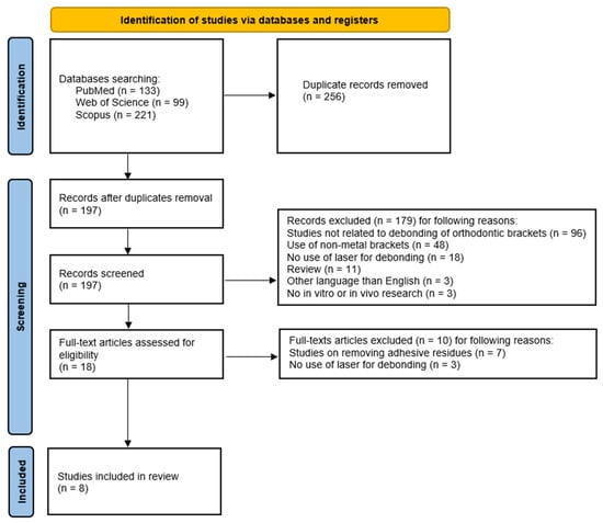 The initial search of the electronic databases yielded 453 records. After removing 256 duplicates, 197 unique records were available for abstract screening. In this phase, 179 articles were excluded based on their abstracts: 96 studies were not related to the debonding of orthodontic brackets; in 48 studies, the authors used brackets made of materials other than metal; in 18 studies, the authors did not use lasers for debonding; 11 articles were reviews; 3 articles were written in other languages than English, and in the remaining 3 publications, no in vitro or in vivo research was conducted. Eighteen articles were left for full-text review. Of these, ten articles were excluded: seven studies were related to removing adhesive remnant with lasers but debonding was performed in the traditional way, and three authors did not conduct laser debonding. As a result, eight articles were selected for both qualitative and quantitative analyses.