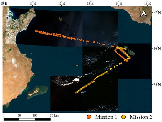 Figure 2) facilitated the acquisition of real-time, in situ measurements for SSS and SST. By leveraging changes in buoyancy to glide horizontally and vertically through the water column, it reached depths of up to 700 m, consistently gathering salinity and temperature data, which was transmitted back to the researcher upon surfacing. The sea glider was employed in two separate missions within the Mediterranean Sea area. The initial mission, launched in the southern vicinity of the Maltese Island near Filfla, extended for a duration of 38 days, commencing on 30 July 2021 and concluding on 6 September 2021. Its trajectory encompassed a journey towards Northern Tunisia before returning to Malta. Conversely, the subsequent mission commenced in the Gozo Channel, situated in the northern region of Maltese Island, lasting for a period of 29 days, running from 9 November 2021 to 8 December 2021. Its course was oriented towards southern Tunisia before returning to Malta. As this research focused exclusively on the sea surface data gathered by the sea glider, in situ data underwent a cleansing process, with any data collected below the initial 5 m depth level being excluded. The missions and satellite data employed in this study are depicted in
