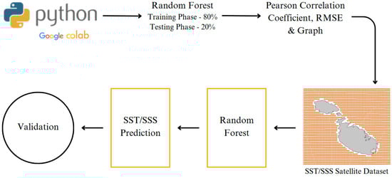 25]. Therefore, this study aims to integrate in situ data, satellite data, and a Machine Learning algorithm, namely random forest, to generate accurate spatial and temporal sea surface salinity (SSS) and sea surface temperature (SST) maps for the Maltese archipelago through multispectral satellite products. Additionally, this paper intends to propose an efficient methodology for acquiring local marine physical data, which can subsequently be utilised within a wider European context, encompassing larger regions characterised by greater temporal and spatial variability.