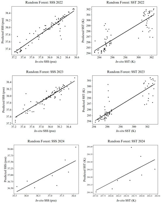 36]. While the relationship between SST and SSS is highly significant in a marine context, it is not the primary focus of this study. Consequently, this correlation is not explored in greater detail, as the main objective is to assess the accuracy of the RF model in predicting these parameters.