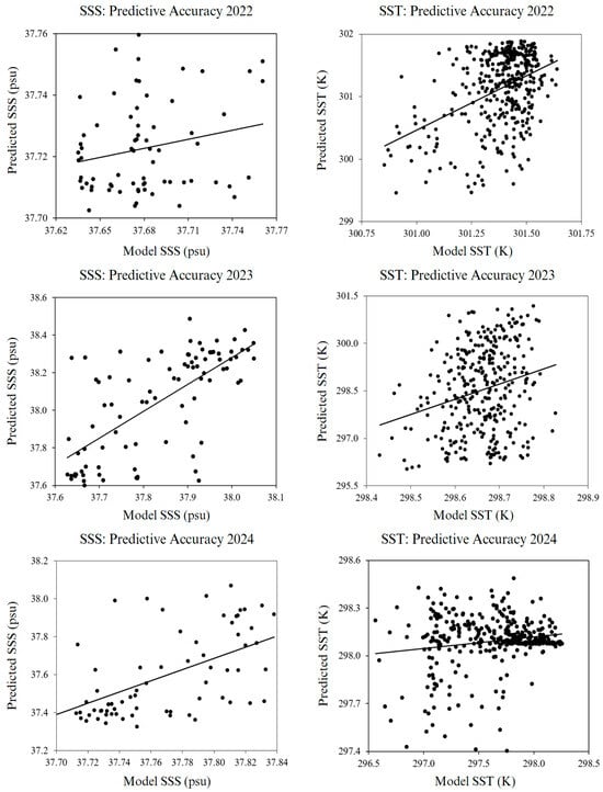 The scatter plot representing SSS data for 2022 exhibits points that are moderately scattered around the line of best fit, indicating some variability in the predictions. Nonetheless, it is important to comprehend that the predicted SSS values for 2022 closely resemble the model data, implying that the RF algorithm generated accurate predictions, albeit with slight variations. In contrast, the scatter plots for SSS in 2023 and 2024 exhibit a stronger and more positive clustering of points around the line of best fit, indicating that the RF model demonstrated superior predictive performance compared to 2022.