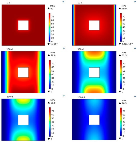 As shown in Figure 9a, there was a strong correlation between expansion stress and water saturation distribution; the stress source of the buffer layer was thermal stress produced by temperature change and expansion stress produced by the saturation process. There was no obvious stress concentration in the high-temperature area around the heater, which may have been due to the relatively weak thermal stress caused by the small range of temperature change. The expansion force began to increase near the boundary of the surrounding rock and decreased near the heater. The reason is that the boundary of the surrounding rock was more strongly affected by water flow and the water saturation was higher, which led to higher expansion stress. The maximum stress of the buffer layer was 4.25 MPa.