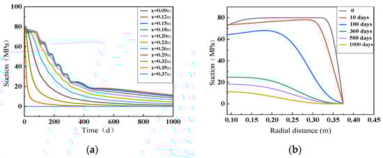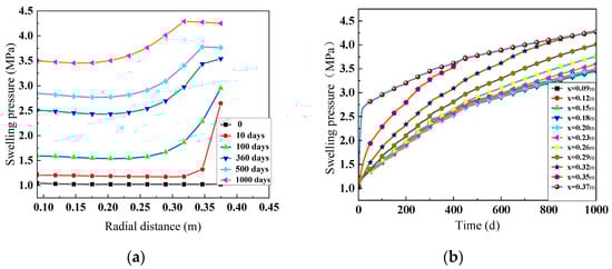 (a) Variation curve of swelling pressure with radial distance; (b) variation curve of swelling pressure with time.