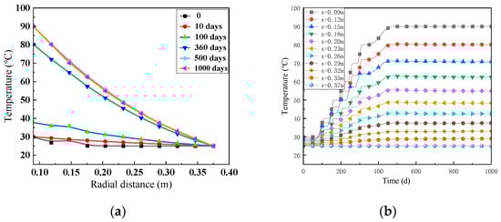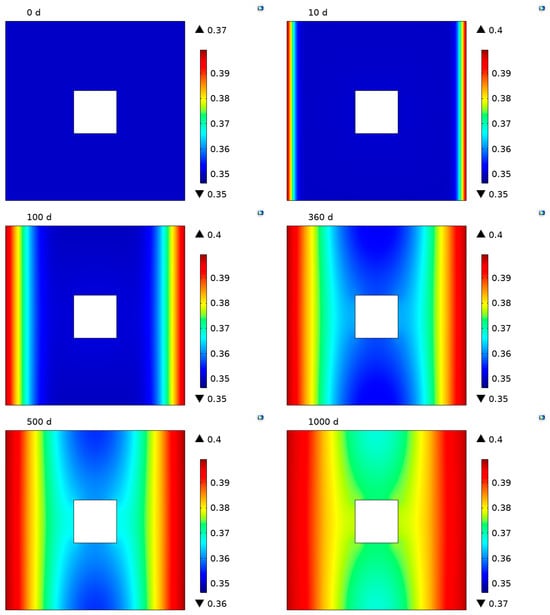 During the first 100 days of irrigation (Figure 5b), the porosity near the hydraulic boundary rapidly increased, while the porosity of the buffer zone near the heater remained almost unchanged. After 360 days, the porosity of the buffer zone near the heater significantly increased, reaching 0.36, and the porosity of the buffer zone near the hydraulic boundary was 0.38. After 1000 days, the porosity of the buffer zone near the hydraulic boundary was 0.40.