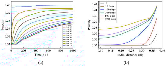 (a) Variation curve of porosity with time; (b) variation curve of porosity with radial distance.