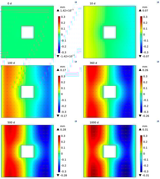 Figure 6 shows the trend of the horizontal displacement of the entire buffer layer. As the experiment progressed, the horizontal displacement moved towards the direction of the heater and slowly increased. At 100 days, due to the expansion of the entire buffer layer near the hydraulic boundary when encountering water, the buffer layer significantly moved towards the direction of the heater. The horizontal displacement value increased slowly after 360 days, which may have been limited by the displacement of the heater and surrounding hydraulic boundaries.
